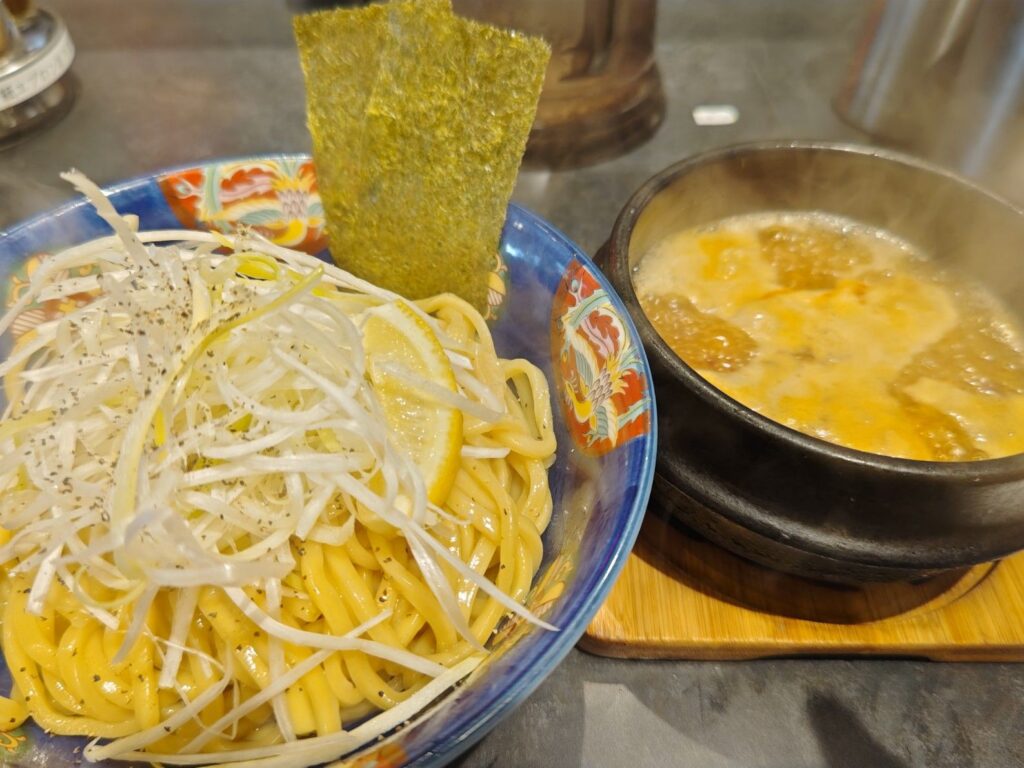 器から沸騰する牛ホルモンつけ汁に、湯気が立ち上がる熱盛り極太麺、その上には白髪ネギの豪華な内容。