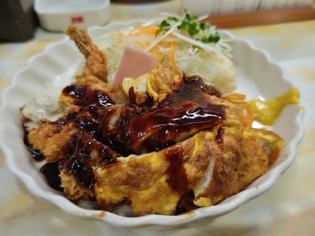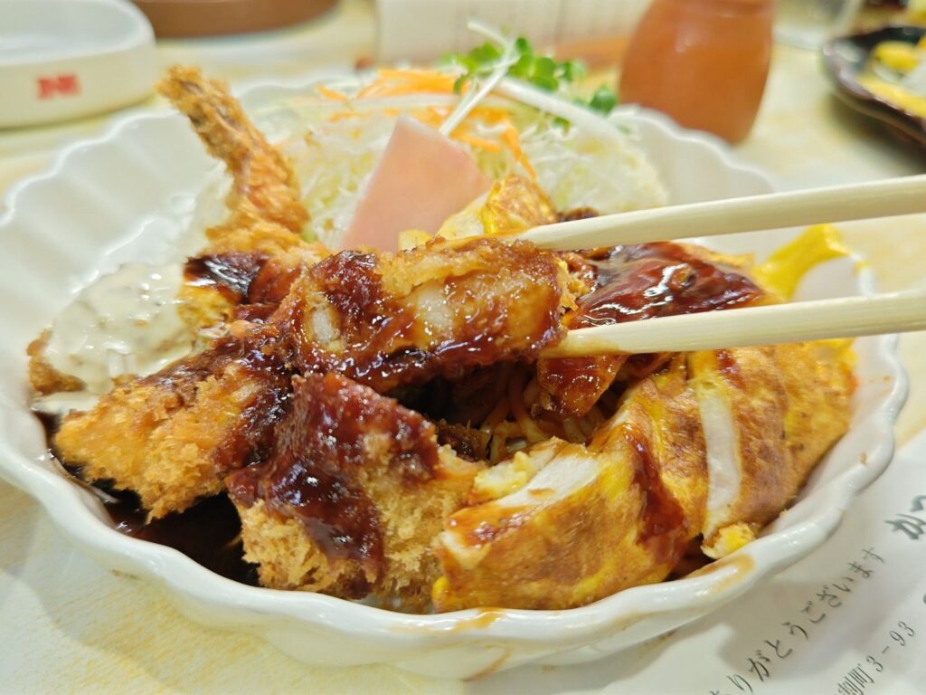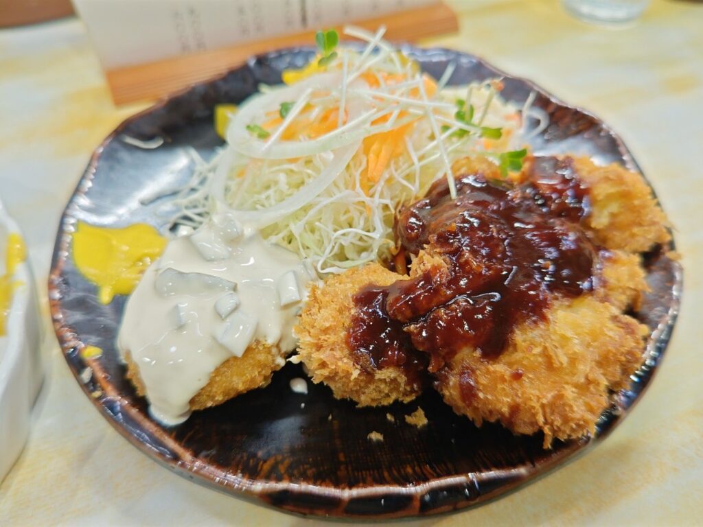 揚げたてのミックスフライには極太な海老フライもあり、ソース仕立が◎でした。